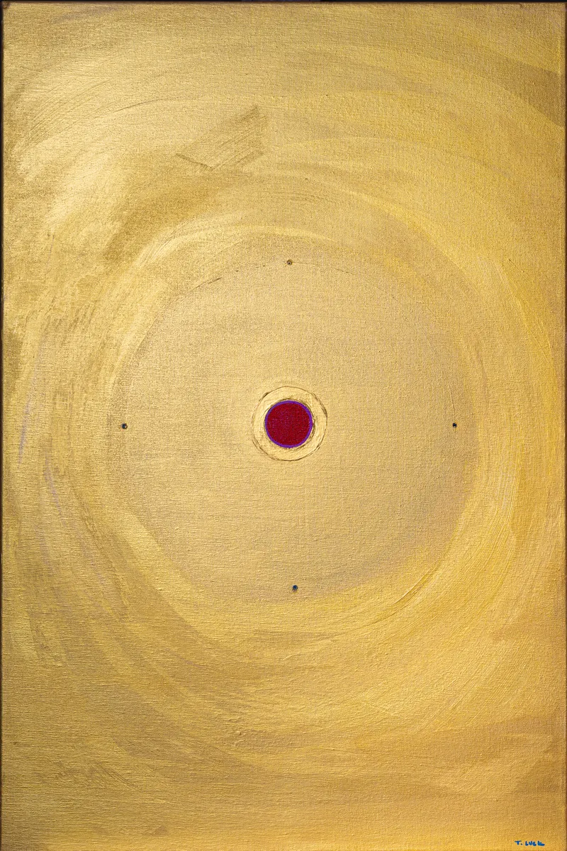 "Harmony" radiates a serene and poised energy, balancing geometric elegance with vibrant chromatic contrasts. Set against a soft, lavender-pink backdrop, the composition plays with symmetry and symbolism through simple yet powerful forms—a gleaming golden semicircle rises from the bottom like a sun, while two rich magenta arcs converge above, cradling a pale violet triangle outlined in gold. The artwork’s precise shapes and luminous palette evoke a sense of universal balance and inner alignment. The golden hemisphere anchors the piece with warmth and grounded presence, while the upward-pointing triangle and mirrored curves suggest expansion, ascension, and unity. The subtle textures within each form add depth without disturbing the minimalist purity of the piece. "Harmony" is a meditative visual experience, offering viewers a moment of calm contemplation. It’s a perfect addition to collections that seek to combine sophistication with spiritual resonance and modern design.