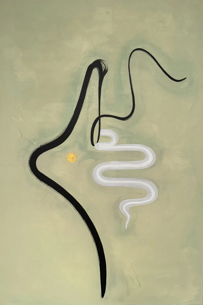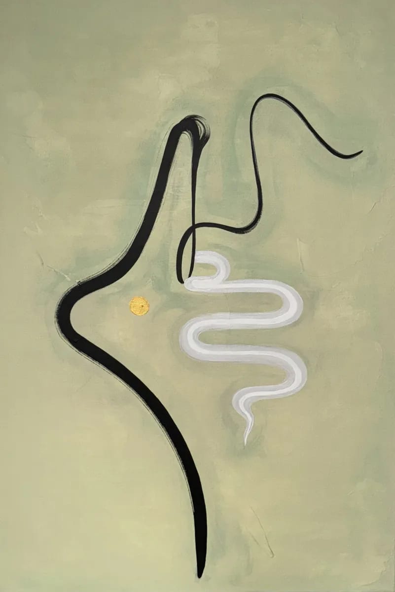 Connections speaks in the language of simplicity and flow. A soft, muted background provides space for bold, sweeping black lines that curve with elegance, suggesting pathways, gestures, or the outline of a figure. A golden circle rests at the heart of the composition, radiating warmth and grounding the piece like a source of life or energy. Beside it, a sinuous white form weaves upward, evoking breath, spirit, or the invisible ties that link us together. The painting feels meditative, capturing the subtle yet powerful ways we are connected — to ourselves, to each other, and to something larger than us.