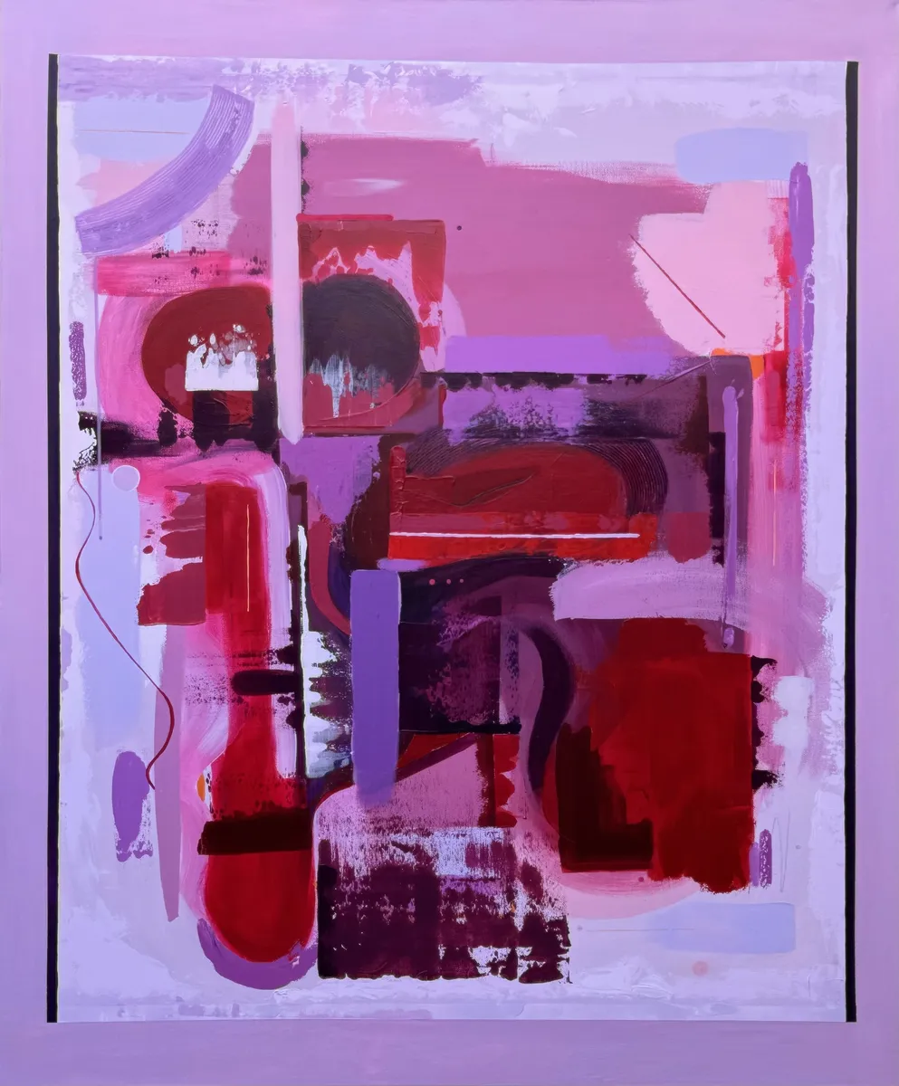 Female Energy radiates with movement, sensuality, and strength. Layers of crimson, violet, and soft pink flow together, creating a rhythm that feels both powerful and nurturing. The composition shifts between fluid curves and bold geometric blocks, embodying the duality of softness and resilience that defines feminine essence. The surrounding lilac frame holds this energetic core, almost like a vessel, emphasizing containment and release, order and chaos. The brushstrokes suggest motion — rising, colliding, expanding — as if the energy is alive and evolving. This work is an exploration of femininity as force: tender yet unyielding, intuitive yet commanding, rooted in creation and transformation.