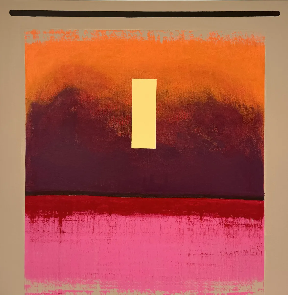 BALANCE, bold contrasts of color and form explore the delicate tension between gravity and stillness. The deep crimson backdrop evokes a vast, introspective space, while the textured blue surface suggests movement and terrain : a metaphor for life’s shifting ground. Three radiant golden orbs punctuate the composition, representing harmony amidst imbalance, light within shadow, and the constant search for equilibrium. This work invites reflection on how stability often exists not in perfection, but in the dynamic interplay of opposing forces.
